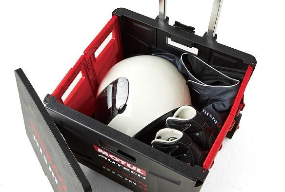 A large-capacity, original Nissan goods container carry. You can easily carry heavy luggage, and the lid is attached to prevent the contents from coming out. When not in use, it can be folded to make it compact, so you don't have to worry about storing it. Equipped with 4 wheels, it is a specification with high controllability. High-strength polypropylene is used for the resin part, and aluminum is used for the bar connected to the handle, providing high durability. With a large logo on the front and lid, the design stands out even in large race venues and from a distance.