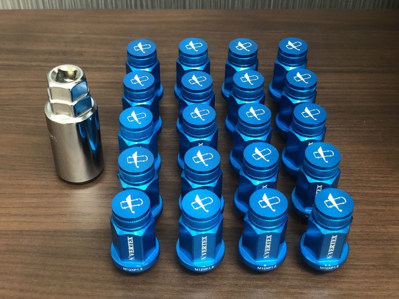 ■VERTEX ALUMINUM RACING NUT■ Vertex aluminum racing nut ※Sales will end as soon as stock runs out. **************************************************** **** Forged aluminum racing nut recommended for street fans. The material used is super duralumin (A7075-T6), which boasts top-class strength among aluminum alloys. In addition, it is a model that also has convenience with knurling that enables quick turning. In addition to the common size of 45mm, the length is also set to a rare 35mm.The included special socket has a soft liner (resin) that protects the nut from damage when torque is applied. In addition to the orthodox black, the lineup includes three colors, red and blue, which have good color development. Both M12 x 1.5 & M12 x 1.25 are available. ■Color settings: Black, Red, Blue ■Size: M12 x P1.5, M12 x P1.25 ■Total length: 45mm ■Bag type, 19HEX, set of 20 *The actual color of the product may vary from the photo due to printing reasons. etc., may differ. *In order to improve the quality of this product, the product price and specifications are subject to change without notice. *If the nut protrudes from the wheel, it may not comply with the vehicle inspection. In addition, it may not be suitable for race inspection if the nut protrudes from the wheel spoke part due to regulations. *After installation, check the installation condition regularly, and check the appearance condition and regular tightening torque management. *Use a torque wrench for installation, and tighten evenly with the torque value recommended by the manufacturer. * Excessive torque may cause damage, so be sure to manually use a socket that matches the nut when removing and installing, and never use an impact wrench or cross wrench for final tightening. * Do not continue to use the product that has received an external impact.