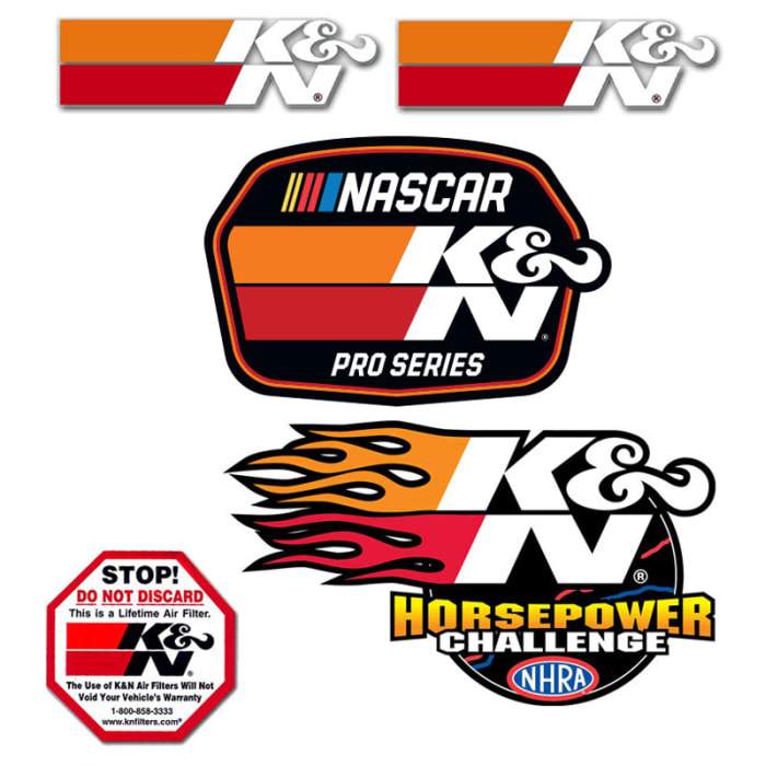 | Product Description | Compatible Engine: K & N Official Goods Product Name: K & N Sticker Set 5 Sheets Mix K & N Logo (White) Sticker (100 x 35 mm) x 2 Sheets K & N STOP Sticker (64 x 64 mm) x 1 Sheet K & N NHRA Sticker (150 x 87 mm) x 1 K & N NASCAR Sticker (150 x 100 mm) x 1 |