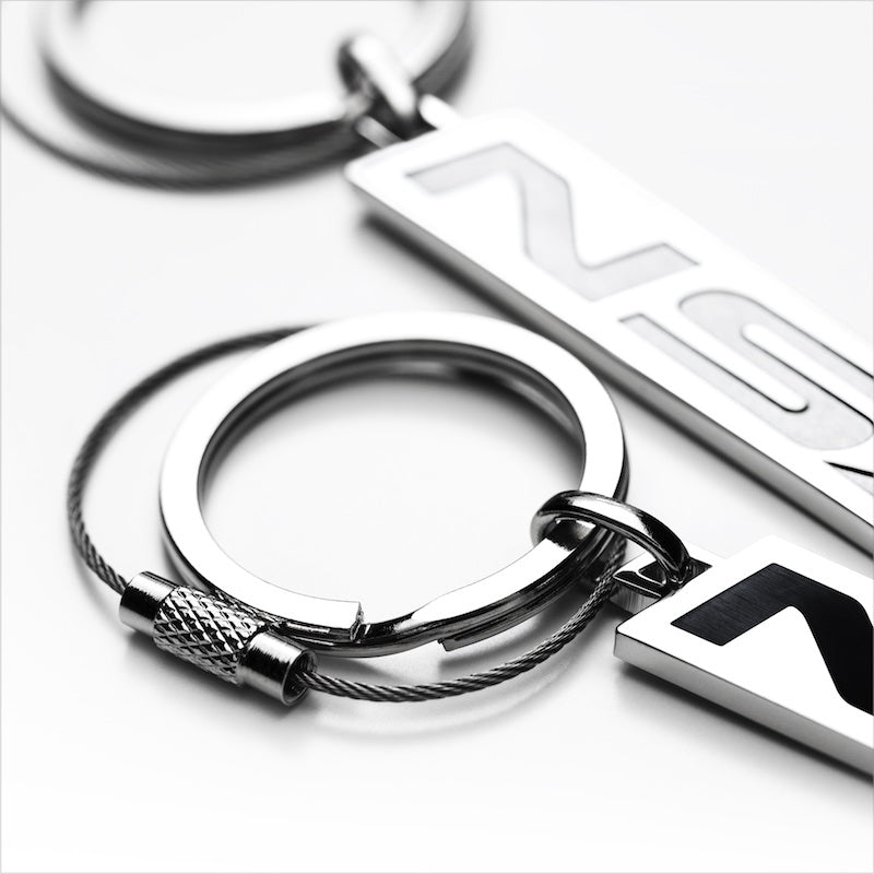 The key ring is the NSX logo, which is full of innovation and speed. The logo part has a black gloss finish. A metal key ring that gives a high-quality impression with the contrast between the glossy silver shine and the black NSX logo. Size: Approximately 12 (vertical) x 71 (horizontal) x 2 (thickness) mm (excluding ring part) Material: Brass, MADE IN CHINA