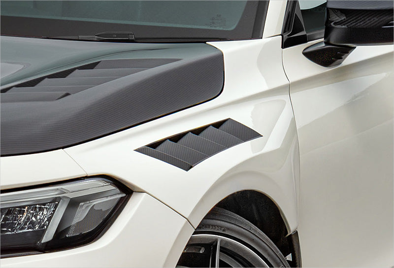 | Product Description | The carbon front fenders are designed to match the angle and width of the hood air outlet ducts, creating a harmonious look from any angle. We recommend painting the entire fender in body color, excluding the duct area. Made from CFRP, they are approximately 1.7 kg lighter. |