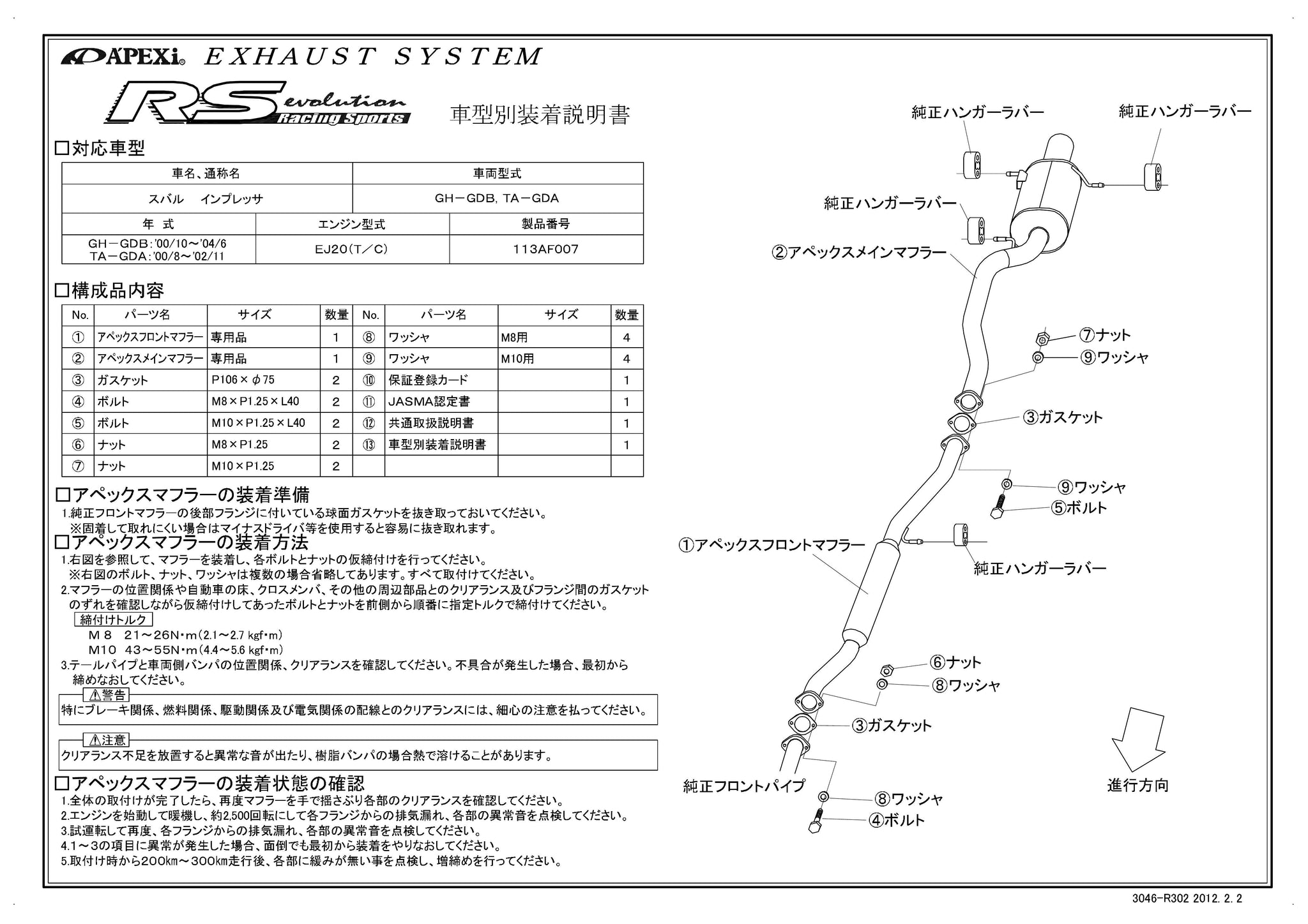 | Product Description | Model Year: 00/10-04/06 Main Pipe Diameter: Ï_75 ___ Ï_85 No of Pieces: 2 Tail Diameter: Ï_120 Oval Exhaust System Type: Exchange immediately after the SUPER CATALYZERlyst Sound Level: 93 Ground Cleance :113 |