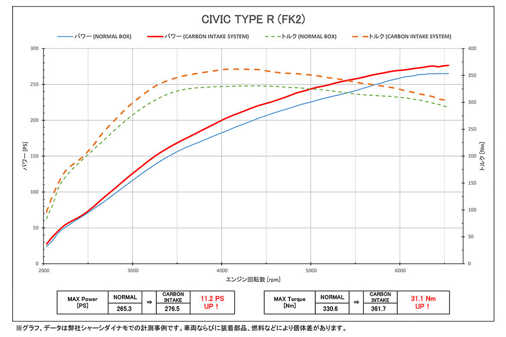 | Product Description | Model Year : 2015/12- Chassis Model: FK2 Engine : K20C Core Type: A3 Product Name: CARBON INTAKE SYSTEM Description: High performance intake system with carbon duct & case that best fits to engine room with advanced forming technology By making carbon ducts & cases, lightweight, high strength and even intake air temperature are properly controlled. Duct & case exclusive for complete vehicle type efficiently captures ram pressure and realizes sharp intake response. A trusted stainless steel mesh filter is adopted as the body of the air cleaner, realizing a supreme inhalation efficiency and lacy sound. Since the stainless steel filter can be used any number of times as it is washed, its capability is semi -permanent. Contributing to dressing up the engine room by using carbon. |