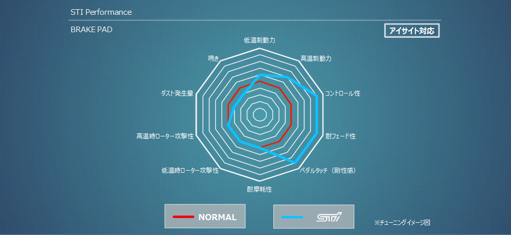 | Remarks | * Brake squeal may occur depending on the driving conditions, weather and other environments. * "Squeal" and "dust generation amount" in the radar chart indicate that they are worse than the standard pad. * Can be combined with a standard rotor * For models with a drilled disc rotor (WRX S4, LEVORG), it is recommended to install a set. |