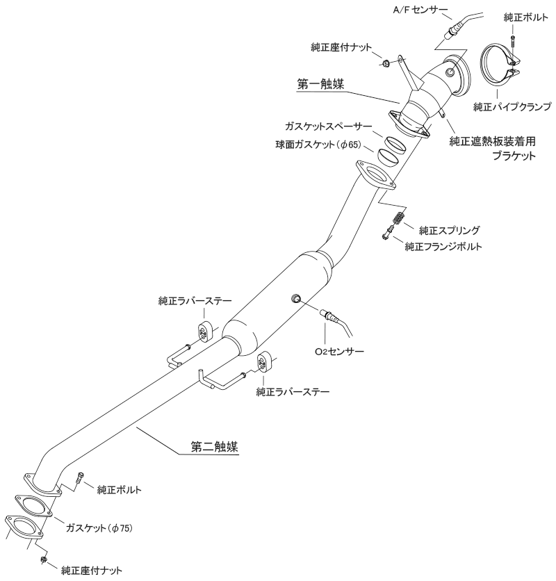 ■ FEATURES: In contrast to the stock fine-grained ceramic catalyst, this product uses a low-density metal catalyst. Both the first and second catalysts are 150-cell specifications, which significantly reduces exhaust resistance. By adopting a cell with an optimized proportion of precious metals in the first catalyst section with the minimum necessary size, we have achieved both purification performance and reduced exhaust pressure, and have obtained an exhaust gas certificate from a third-party organization. The first catalyst part is designed so that a genuine heat shield can be attached as a countermeasure against heat damage*. The pipe diameter is φ70 for the stock φ70, but this product uses φ75. We were particular about the appearance by applying buffing and using TIG welding for all welding.