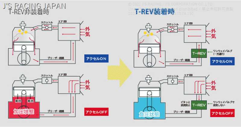 | Product Description | Material: Steel The next-generation engine internal pressure control valve is finally born! !! !! T-REV system created by collaboration between TERAMOTO RACING and J'S RACING! Please experience the J'S RACING version of T-REV with the vehicle-specific settings for Honda vehicles! !! !! Stay tuned for other car models to be released one after another! With the unique decompression setting, you can experience the difference in the rise especially from the middle rpm range. [What is the T-REV system] T-REV is a system that uses the pulsation of blow-by gas called natural decompression. This system simply decompresses the inside of the engine and makes the inside of the crankcase negative pressure, so that the movement of the piston and crankshaft becomes smooth, and the decompression effect is amazing with a probability of almost 100%. Allows you to experience it. -Significantly reduces resistance due to pressure inside the engine -Improved accelerator response -Improved engine feeling during acceleration -Reduced CO2 by reducing the amount of depression of the accelerator > This principle is also adopted in the latest racing machines that demonstrate top performance, and by making the engine response smoother, the miscellaneous parts of each operation are greatly alleviated. SPL parts that have natural machine characteristics from the street to the circuit. [Mounting configuration] _x0003_ This is a system that uses air induction by sucking up blow-by gas in the crankcase with a genuine PCV valve and attaching the T-REV system to the breather hose. It is a system that pulls out the internal pressure of the crankcase by using the negative pressure generated from the exhaust port. In this system, the thickness of the hose, the size of the joint, and the decompression value according to the engine characteristics are set and the TEST is repeated for each model, so you can use it with confidence. [Basic decompression principle] Currently, the "reciprocating engine" is the mainstream internal combustion engine for automobiles on the market. This reciprocating engine is currently the most basic internal combustion engine. 1. Intake 2. Compression 3. Expansion (explosion) 4. Exhaust by repeated movement of the piston in the engine. , It is changed to rotary motion via the crankshaft. In the engine, this work is done at an unstoppable speed of several thousand revolutions per minute. The point of the crankcase decompression valve (T-REV) is in the case under the piston. When the piston is pushed down at high pressure due to expansion (explosion), some gas blows through the piston ring and flows into the crankcase. Such gas is called "blow-by gas", and the pressure inside the crankcase increases due to this blow-by gas, and if the piston goes down at this time, it becomes a strong resistance. This "pumping loss" is one of the engine brakes, but it is also the resistance of the piston movement of the engine. This overpressured blow-by gas is discharged from the breather (holes and pipes / hoses for removing blow-by gas), but the crankcase sucks in outside air when the piston rises or the accelerator is off. The inside is still under pressure. Therefore, by installing the crankcase pressure reducing valve "T-REV" in the breather path, blow-by gas and backflow of outside air are prevented, and the pressure inside the crankcase is optimized (negative pressure) to demonstrate the original performance of the engine. You can do it, and you can get the same power with less fuel. [The splendor of T-REV] "T-REV" has a special structure that is different from the conventional pressure reducing valve. The blow-by gas discharged from the breather is increased in flow velocity by using a hydrodynamic vortex, and a "spiral line" is provided inside the T-REV so that it can be discharged smoothly, and three reed valve surfaces are provided. The structure is such that the force per surface is dispersed and blow-by gas is discharged more smoothly. Since the T-REV uses a reed valve with a characteristic triangular pyramid design, the reed valve malfunctions due to excess outside air from the air cleaner BOX, malfunctions due to emulsion (oil emulsification), and the internal structure. There are no restrictions on the mounting orientation (up, down, left, right) due to the problem of. We have prepared all the components as repair parts so that you can use them for a long time. The shim plate of the reed valve is a consumable item, so it is recommended to replace it regularly. We also accept full overhaul, so please contact us directly. The blow-by gas discharged from the breather is increased in flow velocity by using a hydrodynamic vortex, a "spiral line" is provided inside the T-REV so that it can be discharged smoothly, and the reed valve surface is made three sides. The structure is such that the force per surface is dispersed and blow-by gas is discharged more smoothly. Since the T-REV uses a reed valve with a characteristic triangular pyramid design, the reed valve malfunctions due to excess outside air from the air cleaner BOX, malfunctions due to emulsion (oil emulsification), and the internal structure. There are no restrictions on the mounting orientation (up, down, left, right) due to the problem of. We have prepared all the components as repair parts so that you can use them for a long time. The shim plate of the reed valve is a consumable item, so it is recommended to replace it regularly. We also accept full overhaul, so please contact us directly. The blow-by gas discharged from the breather is increased in flow velocity by using a hydrodynamic vortex, a "spiral line" is provided inside the T-REV so that it can be discharged smoothly, and the reed valve surface is made three sides. The structure is such that the force per surface is dispersed and blow-by gas is discharged more smoothly. Since the T-REV uses a reed valve with a characteristic triangular pyramid design, the reed va