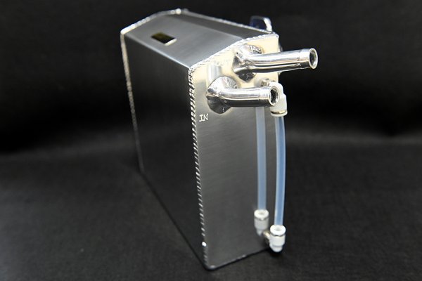 must-have for tuning engines and circuit racing. By installing an oil catch tank, you can keep the inside of the engine clean. If blow-by gas is returned to the engine as is, the combustion efficiency will decrease. By installing a partition inside the catch tank, the moisture and oil contained in the blow-by gas will reduce the performance of important sensors and functional parts. To prevent this phenomenon, a place is provided to collect the gas before returning it to the intake, and liquefied impurities are removed as much as possible. The volume is 2.0L, and the surface has a beautiful mirror finish. The hose is a silicone hose and is an installation kit exclusively for the R35GTR. Dimensions: Height 180mm Width 180mm Thickness 65mm Capacity: 2.0L With level gauge Accessories: Silicon hose Material Aluminum Compatible models R35 GTR Remarks TOPSECRET logo on the catch tank body