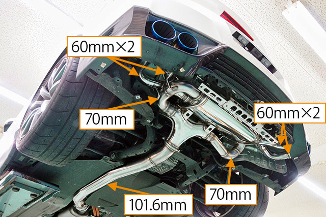 | Product Description | Model: 11/11 - 16/06 Achieves low exhaust pressure with a straight pipe geometry of D101.6mm middle pipe and D70mm x 2 to D60mm x 4 main pipe. In addition, by making the inner and outer tails different in diameter, a dynamic rear visual appeal is obtained. Muffler shape: Ti-1 (Titan) (Super Turbo Muffler) Main Material: S304 Tail Outer Diameter: 124, 110 Intermediate Pipe Diameter: 101.6 → 70×2, 60×4 (※1) Nearby exhaust noise: normal 92 Nearby exhaust noise: HKS 87 Portion of the kit: Mid pipe |