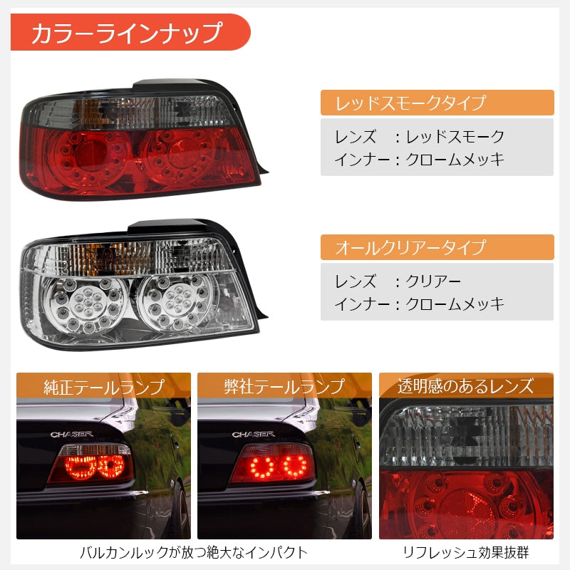 | Product Description | ▼ A classic tail lamp that has been popular for many years ▼ A hugely popular model with an exceptionally clear crystal lens that is also a favorite among Chaser drivers overseas! It is also ideal as a replacement part for refreshing genuine tail lamps that have become dull over time, or for preserving genuine parts that have become increasingly expensive. ■One set (left and right) ■18 high-brightness LEDs per side ■Built-in reflector model ■Plug-in installation --- Compatible models --- Model: GF-GX100 / GF-JZX105 / E-GX100 GF-SX100 / GF-JZX100 / E-SX100 KD-LX100 / GF-JZX101 / E-JZX100 GF-GX105 / E-JZX101 / E-JZX105 KD-LX100 Vehicle name: 100 series Chaser (early and late models) Year: September 1996 (Heisei 8) to October 2001 (Heisei 13) ▼Grades Compatible with all grades, including Avante / Tourer / XL / Tourer S, Avante G, Raffine, and Tourer V |