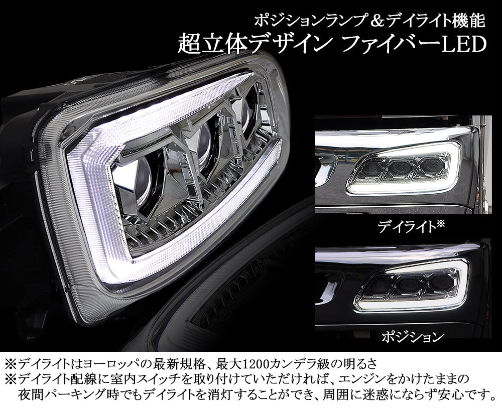 | Product Description | ◆Compliant with vehicle inspection and safety standards, with E-mark◆ Night Star Hino Ranger/Profia/J-bus Selega/Gala projector LED headlights The brightness far exceeds that of genuine headlights, ensuring visibility and reducing driver fatigue. Equipped with a daytime running light function that can reduce the accident rate, and designed with safety in mind, the triple LED projector and U-shaped fiber LED are headlights that can greatly change the appearance. It has acquired the safety standard E-mark and is compatible with vehicle inspections, so you can install it with confidence. It is also recommended for insufficient light during vehicle inspections due to lens yellowing and dullness caused by aging. ■Projector LED ・2 outer lights Hi/Lo beam (switchable) ・1 inner light Fog lamp ■U-shaped three-dimensional fiber LED ・Daytime running light function (lights up when engine is on) By turning on during the daytime while driving, 1The driver's own safety awareness can be increased. 2It can call for road safety to other drivers and pedestrians. 3It can make the other party aware of the presence and position of the vehicle with the lights on. Therefore, it is expected to prevent accidents. Lights up at 1200 candela, the same brightness as current European cars. E-mark (ECE R87) acquired. Compliant with new safety standards (1440 candela or less). Position: When the position is ON, it dims from the daylight and functions as a position lamp. *The safety standards require that the daylight be turned off or dimmed when the position is ON, and this has been cleared. The U-shaped, ultra-three-dimensional LED fiber part changes brightness in two stages between daylight and position, giving it more impact and performance than new cars. ■Coupler-on installation. Easy wiring with a leveler included, just insert the main coupler into the harness on the vehicle side. The installation time can be significantly reduced with the same replacement method as the original headlight. *The daylight is usually wired to light up when the ignition is ON, but by installing an interior switch, the daylight can be turned off even when parking at night with the engine running, so you can rest assured that it will not be a nuisance to those around you. ■Compliant with safety standards. It has passed the US DOT vibration standard and has acquired the E-mark, which also complies with vehicle inspections, so you can install it with confidence. ■Warranty: Water leakage and LED failure warranty (1 year or 100,000 km, whichever comes first) *The warranty is based on our company's terms and conditions. ■New left and right set In the event of an accident or breakdown, we can repair or sell just one side, so please feel free to contact us. (Only for customers who have confirmed the purchase history of our products) ■Color: Chrome type/Black type ■Installation instructions included ※※ Please be careful of similar copy products! ※※ There are copy products on the market for this product. Purchasing a copy product may cause great damage to the customer, so please be careful when purchasing and purchase our genuine product. |