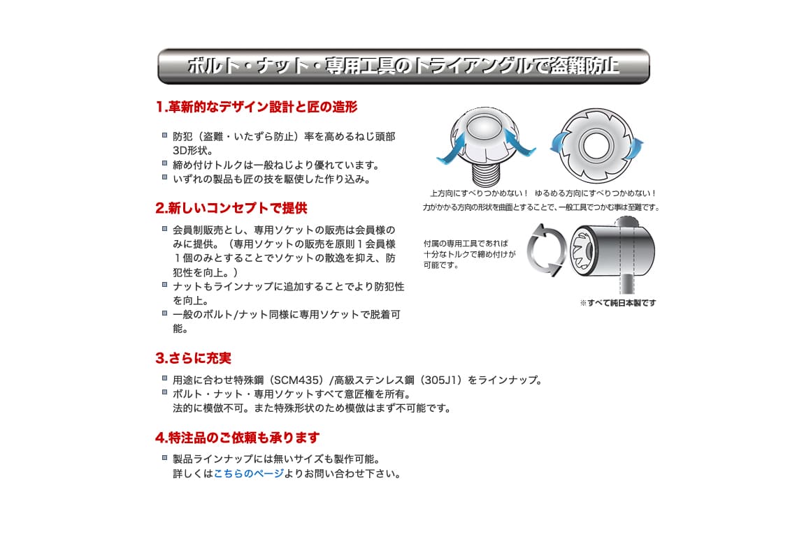| Product Description | Product Details: Unifas anti-theft bolts are an innovative screw kit (bolts, nuts, special tools) with a high level of security, created by a group of screw craftsmen who combined their skills. This kit is ideal for preventing rear ladder theft. Please choose from two types that match the type of rear ladder. Although it is a full-fledged anti-theft bolt, it is easy to install and remove using a special tool, and by using stainless steel, it is rust resistant and looks beautiful, protecting your car. A set includes a special tool and two types of bolts, long and short (one each).The long bolt is for the optional 10mm spacer on the rear ladder, and the short bolt is for use when the 10mm spacer is not used. Please refrain from using long bolts without spacers as this may damage the wiring inside the gate. ■The triangle of bolts, nuts, and special tools prevents theft 1. Innovative design and craftsmanship ●3D screw head shape increases security (theft and tamper prevention) rate. ●Tightening torque is superior to general screws. ●Each product is made using the skills of craftsmen. 2. Offered with a new concept - Sales are based on membership, and exclusive sockets are only available to members. (As a general rule, only one special socket is sold per member, which reduces socket dissipation and improves security.) ●Adding nuts to the lineup further improves crime prevention. ●Can be attached and detached using a special socket like regular bolts/nuts. ●We own design rights for all bolts, nuts, and dedicated sockets. Legally impossible to imitate. Also, due to its special shape, it is almost impossible to imitate it. |