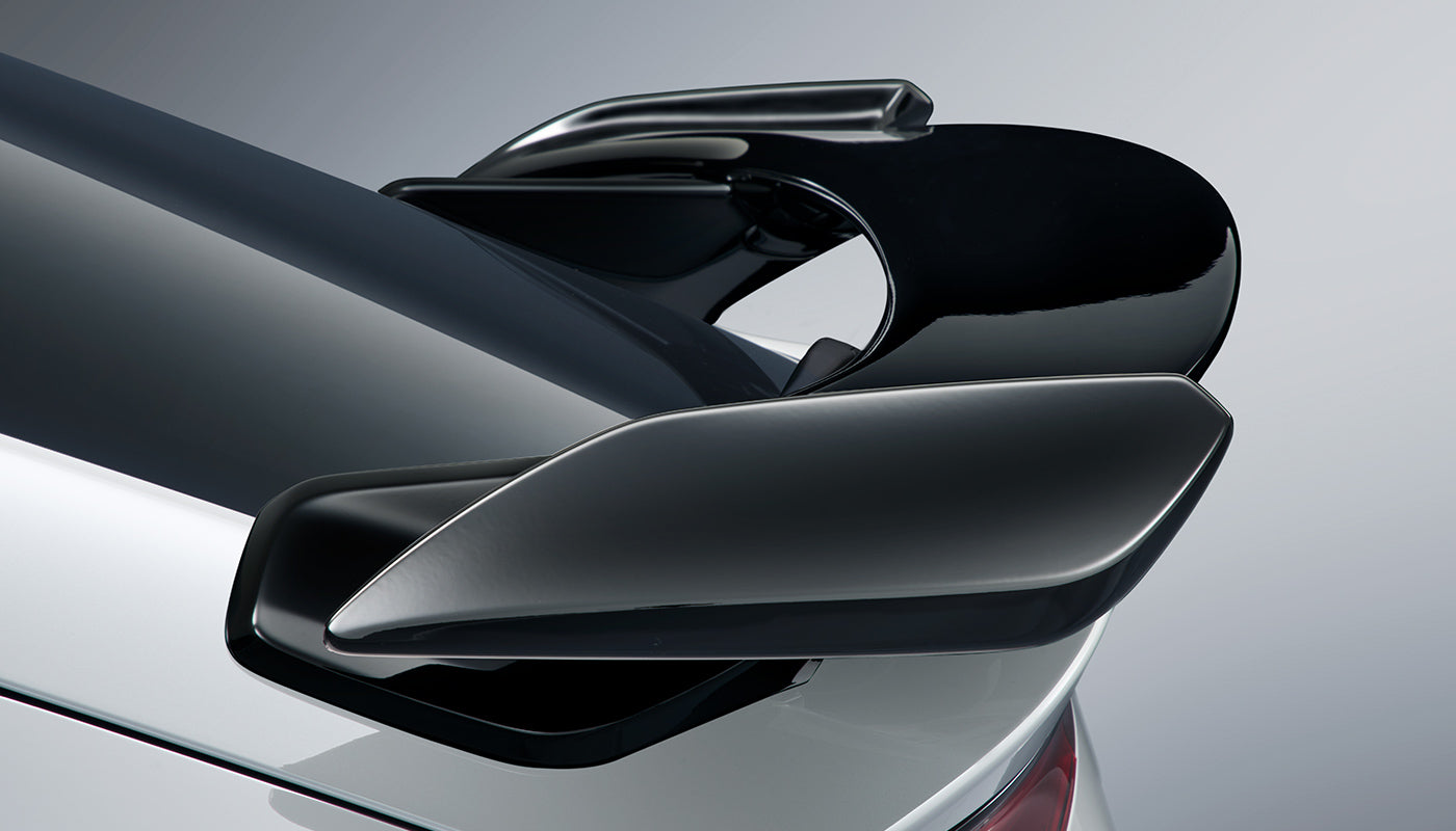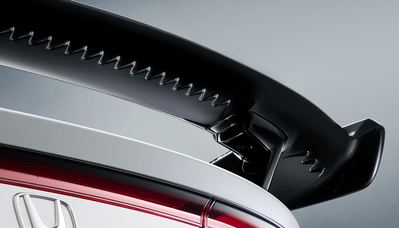 Optimized the design and “effective aerodynamic” function of the tailgate spoiler for the CIVIC TYPE R. The serrated blade (chevron) shape on the underside of the wing reduces turbulence and improves vehicle stability.The serrated chevron shape on the underside of the wing reduces turbulence and improves vehicle stability.Effective aerodynamics.. .