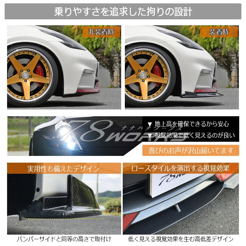 | Product Description | ▼ A long-awaited part is now available ▼ This is an original front lip spoiler made for the 78WORKS demo car, but due to numerous inquiries, we have begun selling it as a made-to-order (Made in Japan) product with the cooperation of our aero craftsmen. ■Made in Japan by skilled craftsmen ■Includes installation instructions ■Includes installation bolts and washers ■Available in two types: FRP and carbon *FRP has a black gel finish *Carbon has a clear gel (not weather resistant) finish *Both FRP and carbon are aero parts, so they require priming and painting *Drilling holes in the bottom of the front bumper for installation bolts is required --- Compatible models --- Model: 4BA-Z34 / CBA-Z34 Vehicle name: Z34 Fairlady Z Late model Year: July 2014 (Heisei 26) to July 2022 (Reiwa 4) ▼Grade: Nismo For use with late-model Nismo bumpers only |