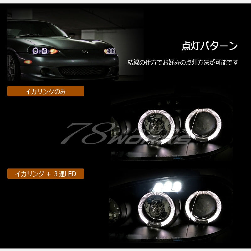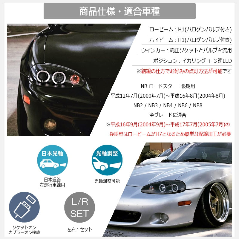 | Product Description | ▼ A classic part that has been popular for many years ▼ A sporty squid ring model that even exudes the atmosphere of European cars, loved by overseas Miata and MX-5 owners! It is also an ideal replacement for eye-catching refresh headlights that have become dull over time, or for preserving genuine headlights that have become increasingly expensive. ■One set (left and right) ■Black type ■Japanese beam axis specification ■With beam axis adjustment function ■Includes original 78WORKS instruction manual ■Plug-in connection *Please connect the squid ring and triple LED according to your preferred lighting method (Details are provided in the instruction manual, so you can rest assured) ■Halogen bulb included *HID kit and LED bulbs can also be installed --- Compatible models --- Model: GF-NB6C / GF-NB8C / NB2 / NB3 / NB4 Vehicle name: NB Roadster (late model) Year: July 2000 (Heisei 12) to August 2004 (Heisei 16) ▼Grades M / SP / S / RS / VS RS-II / YS Limited Mazdaspeed NR-A / MV Limited SG Limited / Turbo, etc. Can be installed on all grades *The final model from September 2004 (September 2004) to July 2005 (July 2005) has H7 low beams, so simple wiring work is required, but please rest assured as this is explained in the original instruction manual. *If installing on an early model, a later face will be required. Change to a later bumper, modify headlight wiring, replace turn signal bulbs, etc. *If an early model has been converted to a later face, or if a later model has had its original headlights replaced due to accident repair or a refresh, please check the low beam bulb size. If the low beam is HB4 → Can be installed If the low beam is H7 → Wiring work is required for installation |