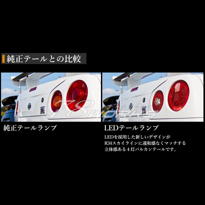 | Product Description | One set (left and right), built-in reflector, 36 high-brightness LEDs (per side), crystal clear lens, socket-on connection. Please use the original tail lamp panels. Compatible models: R34 Skyline 2-door Coupe (1998-2001), GT-R (1999-2002), all early and late models (HR34, ER34, ENR34, BNR34), GT, 25GT, 25GT FOUR, 25GT Turbo, 25GT-V, GT-R, GT-R V-Spec, GT-R V-Spec N1, GT-R V-Spec II, GT-R V-Spec II N1, GT-R M-Spec. |