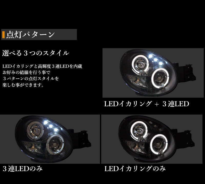 | Product Description | ・One set (left and right) ・Black type ・Japan beam axis specification ・High-brightness triple LED ・Bulb included ・LED squid ring ・Socket-on installation ・3 lighting patterns 【Compatible models】 GD series Impreza WRX (early model) / halogen-powered vehicles |