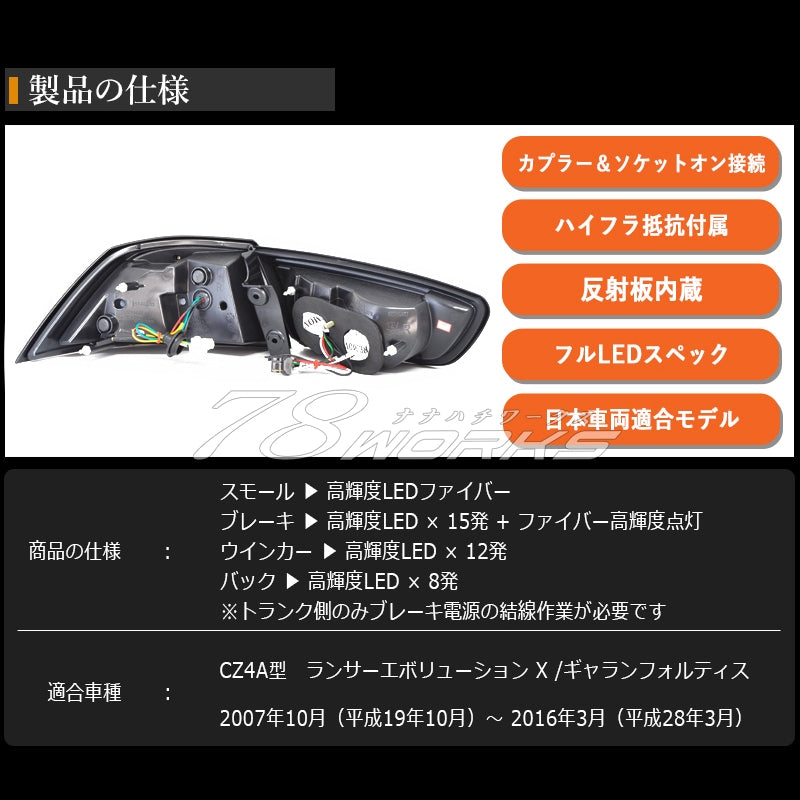 | Product Description | Includes one set of left and right lights. Features a red clear finish, built-in reflector, and a built-in resistor to prevent hyper flashing. Features high-brightness LEDs. Includes a coupler and socket-on connection. Only the brake wiring on the gate side needs to be connected. Compatible models: CZ4A Lancer Evolution X, Galant Fortis, and others from October 2007 to March 2016. |