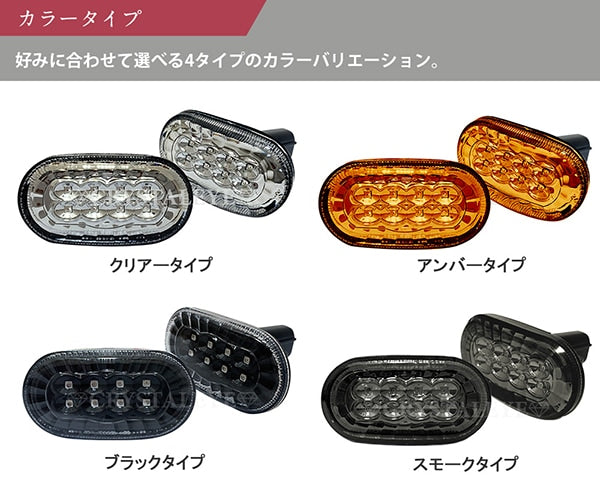 | Product Description | Compatible model Compatible model Representative model Year Jimny JB64W 2018/07 ~ (2018/07 ~) Jimny Sierra JB74W 200 18/07 ~ (2018/07 ~) Jimny JB23W ( 6/7/8 type) 2005 / 10-2012 / 04 (2005 / 10-2012 / 04) Jimny Sierra JB43W (5/6/7 type) 2005 / 11-2012 / 04 (2005 / 11-2012 / 04) Lapin HE21S (4/5/6 type) 2005 / 12-2008 / 11 (2005 / 12-2008 / 11) Carry Truck DA63T 2005 / 11- (Heisei) 17/11 ~) Mazda AZ Off-Road JM23W 2005 / 10-2012 / 04 (2005 / 10-2012 / 04) Similar to Jimny, only models equivalent to 6-8 type Spiano HF21S 2005 / 12-2008 / 11 (2005 / 12-2008 / 11) Similar to Lapin, only models equivalent to 4-6 type Scrum truck DG63T, DA63T (H17 / 11 M / C or later- ) 2005/11 ~ (2005/11 ~) Chevrolet Chevrolet Cruise HR52S 2006/05 ~ (2006/05 ~) New release !! For Suzuki models (Compatibility table required) Confirmation) LED Crystal LED Side Marker Sequential winker type with impact. Crystal eye new product Finally, the sequential turn signal type that flows through the LED side marker is now available. Moreover, the brightness at the time of lighting with 8 high-brightness SMD chip type LEDs and the side view in which the LEDs are lit in grains are outstanding impact. Coupler on with built-in high-flare prevention resistance. ■ New left and right set ■ Built-in high-flare prevention resistance ■ Coupler on ■ High-brightness SMD type LED 8-shot specification ■ Color: Clear / Amber / Smoke / Black > Check the compatibility table for compatible models (Please contact us for compatible models not listed in the compatibility table.) * Please check if the LED side marker and the genuine shape are the same before purchasing. * There may be uneven coating inside the lens. |