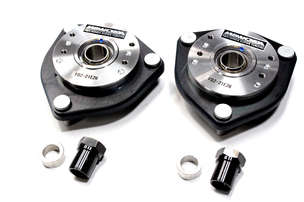 | Product Description | Front pillow upper mount for series-wound springs with camber angle adjustment function. The FK8 upper mount, which requires strength and high rigidity, uses a large diameter 22φ size pillow ball, and the mount bracket uses a high rigidity steel material. Select a series-wound 65φ for the spring. Pillow upper mount that matches the Orleans damper KIT. The diameter of the shaft is 12φ with a pitch of 1.25, so it can be installed on dampers of other companies. Specifications: ■ With camber angle adjustment function ■ Uses a large diameter pillow ball of 22φ in consideration of strength ■ Uses high-rigidity steel material for the mount material ■ Uses 65φ for the series-wound spring |