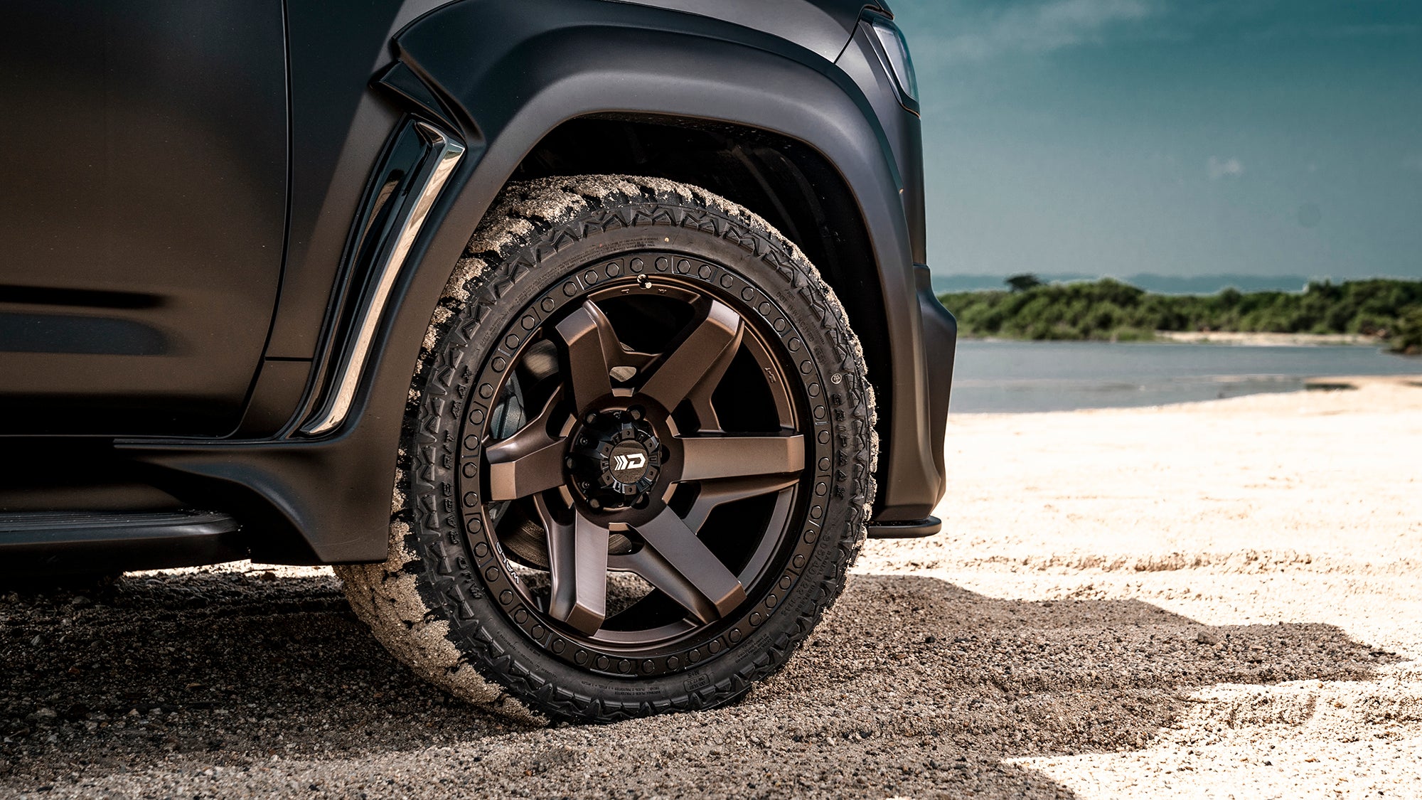 | Product Description | WALD New Wheel Design called DS001 from “DESERT LINE” Collections. Like for an Armored Car, the impression of DS-001 must be a tough-as-nails shape which is suitable for the off-road tires. SIZE: 22 x 10.5 (*1)(*2) Inset: -10 FACE: 2 P.C.D/Hub Diameter: 6/139.7 / 106.2φ Face: 2 |