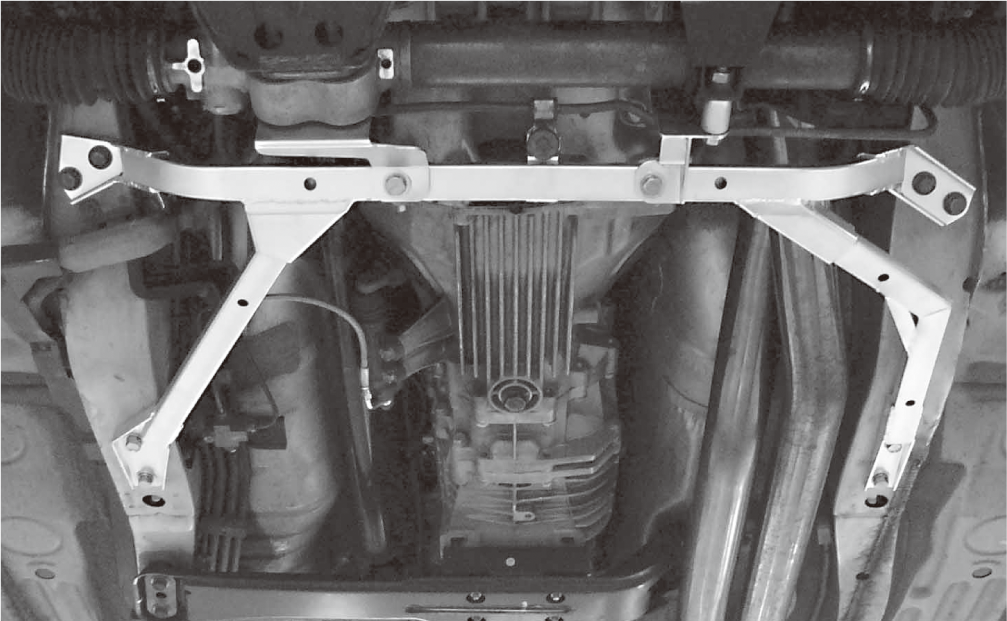 Front: After replacing the genuine of the front cross bar, add the mount to the steering rack. Center: After replacing the genuine center cross bar, add fastened to the rear suspension stays.