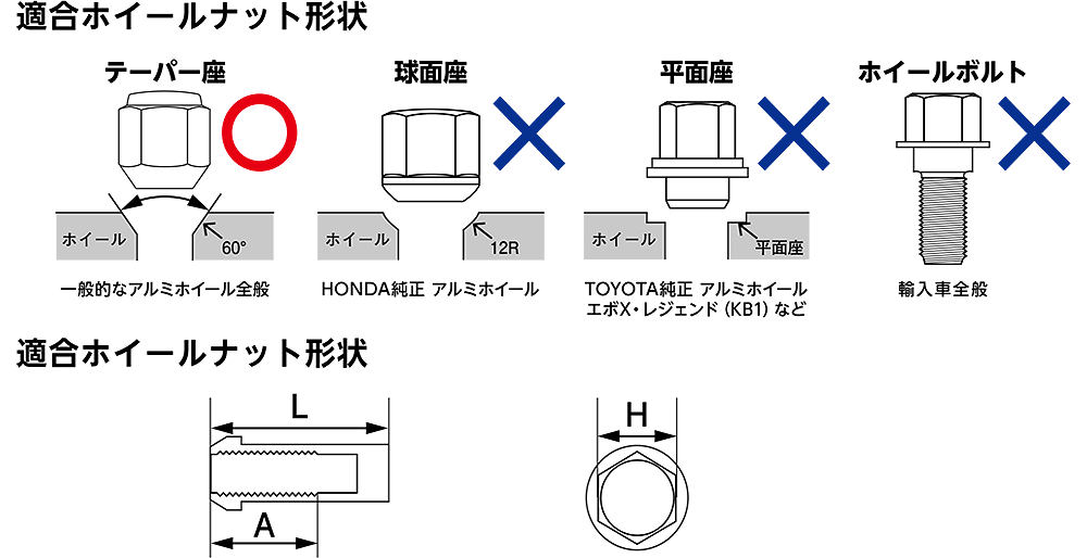 | Product Description | A high-strength locknut that uses a heptagon (heptagon shape) that cannot be attached or detached with ordinary tools to protect important wheels from theft. The nut end is equipped with a removable end cap of green alumite color, and it can be used in two forms: penetration and bag type. Material: 28BCrVM forged, aluminum cap Size: M12xP1.25 / M12xP1.50 Contents: Nut x 20 / Adapter x 1 / L type wrench x 1 Overall length (L): 28mm Effective Screw length (A): 20mm Width across flats (H): Heptagon Weight: 27g Accessories: (19 / 21mm tools can be used) |