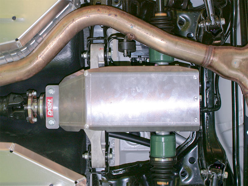 Firmly guards the rear differential from contact with the road surface and stone splashes during rally and dirt trial runs.