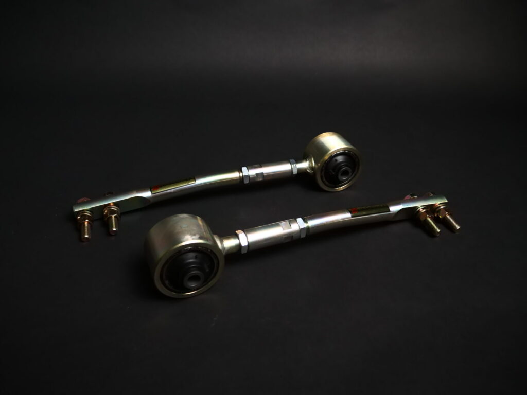 Tension Rod (Bush type) A tension rod that holds the suspension in the longitudinal direction. The stock bushing has a "longitudinal loss" for quiet performance, so the bushing bends greatly under high G driving such as circuit driving, resulting in toe change during braking and deterioration of road information. will invite In this item, by increasing the rigidity of the bush with pillow balls and reinforced rubber, weak points are eliminated and a stable cornering approach is realized. In addition, it is possible to set the caster angle and wheel base by equipping the rod body with a turnbuckle adjustment part. *Adjustment range Bushing type [IFAD04001, IFAD04003] -14 to +10mm [IFAD04002] -20 to +10mm *Air guide plate cannot be attached