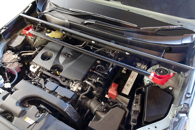 | Product Description | It is effective in increasing the body rigidity and improving the turning performance. The lacy texture of real carbon baked on the aluminum oval tube adds an accent to the engine room and stirs the sports mind. Product details: Front tower bar Specifications: Shaft: Aluminum oval tube, Real carbon baking base plate: Steel plate, Red baking finish |