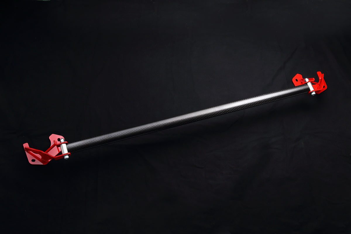 | Product Description | The standard strut tower bar for reinforcement is an alcarbon type that uses a lightweight and highly rigid type with real carbon baked on an aluminum oval tube. By connecting the strut tower to the left and right, you can experience the sure handling that suppresses the distortion of the car body and the improvement of turning and grounding. Product details: Front tower bar Specifications: Shaft: Aluminum oval tube, Real carbon baking base plate: Steel plate, Red baking finish |