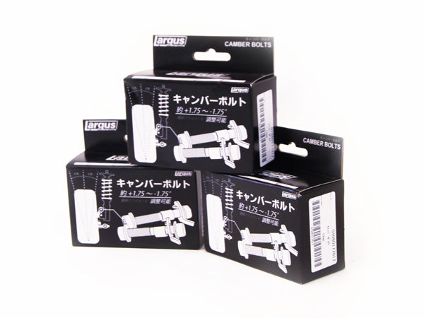 | Product Description | Product: Largs Camber Bolt Bolt Size: 14mm Dimensions: A: 15mm B: 11mm C: 14mm D: 70mm E: 18mm Material: Nut Body: Steel / Top End: Aluminum Quantity : 1SET / 2 pieces Adjustment range: ± 1.75 ° Precautions: ・ It is strongly recommended to adjust the alignment after installation. ・ The camber angle that can be adjusted using this product varies depending on the model and usage conditions, so we cannot answer. ・ This product is exclusively for strut shape. It cannot be used with suspensions of other shapes. ・ The product image is a sample image. Colors may vary depending on the bolt size and production rod. Compatible Models: |
