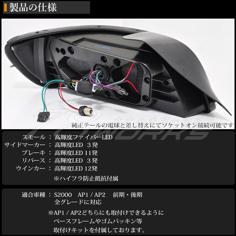 | Product Description | ・One set (left and right) ・Black type ・Built-in reflector ・Built-in side marker ・Socket-on connection ・Includes high-flash prevention resistor ・Includes installation kit for early and late models [Compatible models] S2000 AP1 / AP2 (early and late models) Compatible with all years and grades |