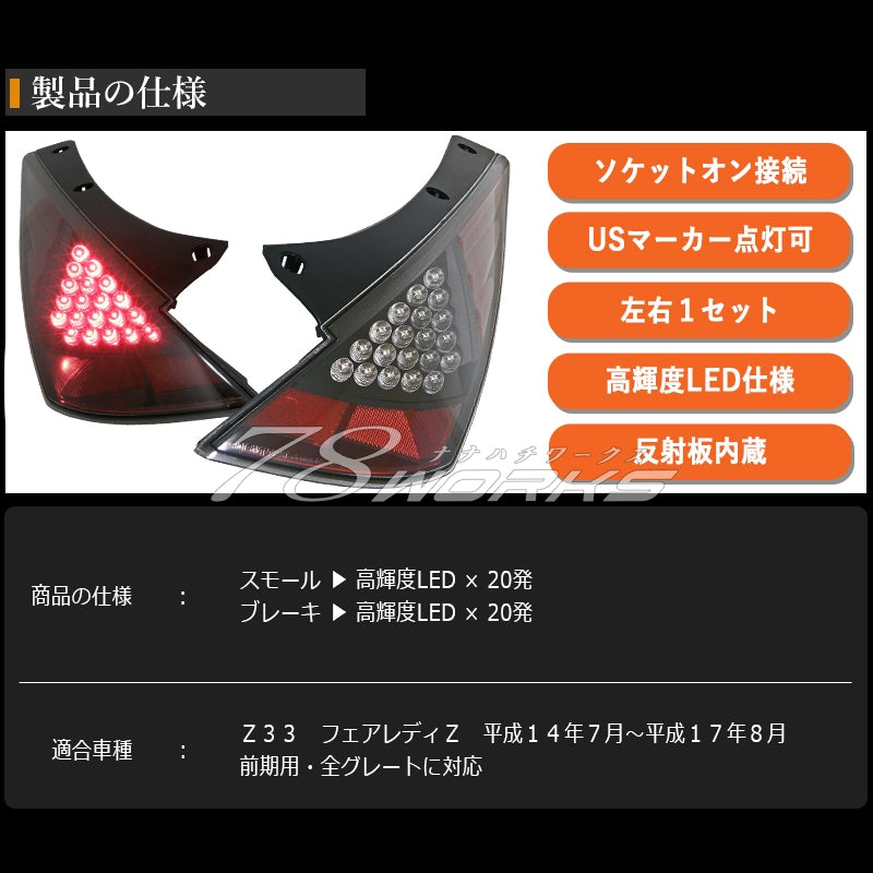 | Product Description | One set (left and right) - 20 high-brightness LEDs - US marker socket hole included * Socket and wiring required to light up. Be sure to cover the socket hole when not in use. - Built-in reflector - Socket-on connection [Compatible models] Z33 Fairlady Z (July 2002 to August 2005, early model) Compatible with all grades UA-Z33 / UA-HZ33 Base Grade Version T Version S Version ST Type E Roadster Roadster Version T |