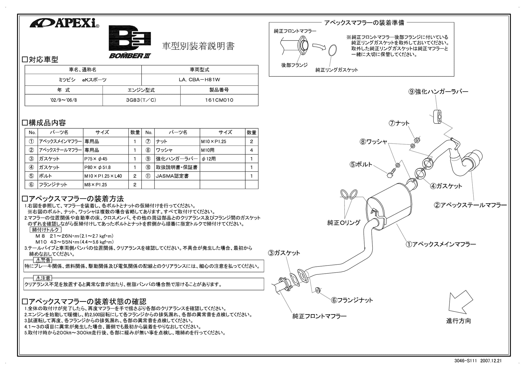 APEXI BOMBER 3 Exhaust For MITSUBISHI eK Sport H81W 161CM010