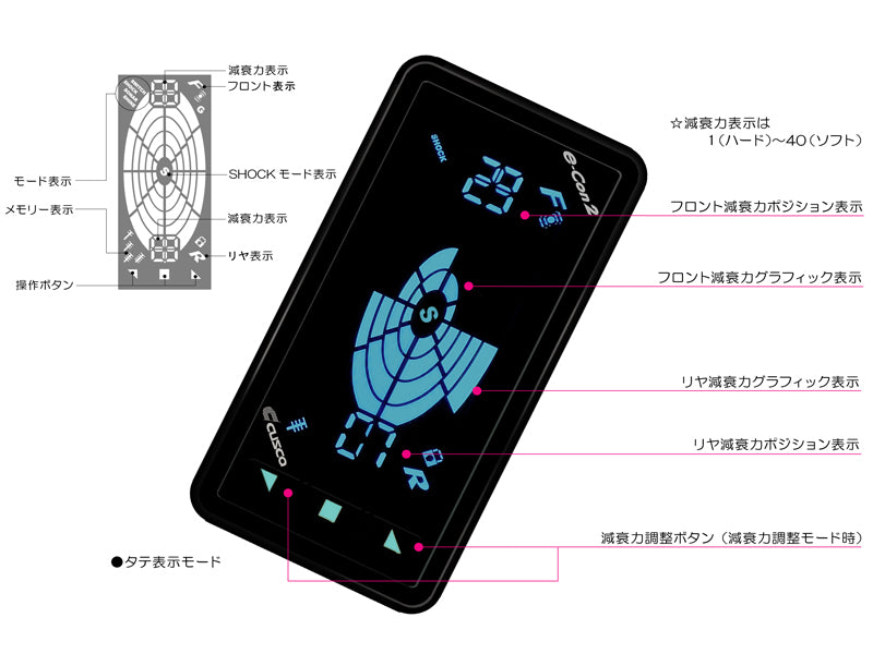| Product Description | "e-con2" is a new model of "e-con" that allows you to adjust the damping force without leaving the car. The damping force can be adjusted in 40 steps, and the compact and slim body has a large display that is easy to see. ■ Easy to operate, slim and compact controller ・Simple button operation allows independent adjustment of front and rear damping force in 40 stages ・Controller size: W47×H91×D13mm ■Illumination display with 7 colors to choose from ・You can choose your favorite color from seven colors: blue, green, purple, red, sky blue, white, and yellow. |
