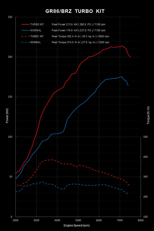 | Product Description | Product features●This is a bolt-on turbo kit developed exclusively for GR86/BRZ. We tested multiple turbochargers that matched the FA24 engine and selected the best compressor wheel, cover, and exhaust housing combination. The turbo starts working smoothly from low revolutions, and you can feel the acceleration all at once until around 6000 rpm.- Considering the improved lateral bending and torsional rigidity of the vehicle body compared to the previous model (ZN6/ZC6) and safety, we have minimized the body modification that is common in retrofitted turbo kits and created a bolt-on kit while maintaining the stock body. I succeeded in doing so. Compared to our previous turbo kit, installation time is reduced by approximately 1.5 hours.●With a stock engine and without changing the fuel system, the maximum output is normal +50PS (approx. 290PS) with a set boost pressure of 39.2 to 44.1kpa (0.4 to 0.45kg/cm2), and a maximum torque of 39kg・m is generated at 3800rpm. To do. (Based on in-house testing) You can feel the acceleration unique to a turbocharger from around 2800 rpm, and its power is demonstrated not only in city riding but also on winding roads and circuits.●The shape of the air-cooled intercooler core has been changed to reduce heat sag due to increased intake air temperature and power down in the summer. This expands the range of settings and allows for future power increases.●By rewriting data with the GReddy performance ECU (sold separately), smooth acceleration is achieved as if the GR86 had a genuine turbo specification. In addition, by carefully creating map data, we have been able to ensure that fuel efficiency does not deteriorate significantly despite the increased power.*Fuel efficiency may drop significantly depending on driving conditions and driving style.●Since the product is developed with the assumption that a normal clutch will be used, it is possible to increase power while reducing the initial investment in the drive system.*Replacement may be required depending on mileage and degree of clutch wear.●With a catalytic converter, there is no need to change the structure, and you can obtain continuous vehicle inspections at private vehicle inspection stations as well as dealers without any problems by submitting a certificate of automobile exhaust gas test results. |