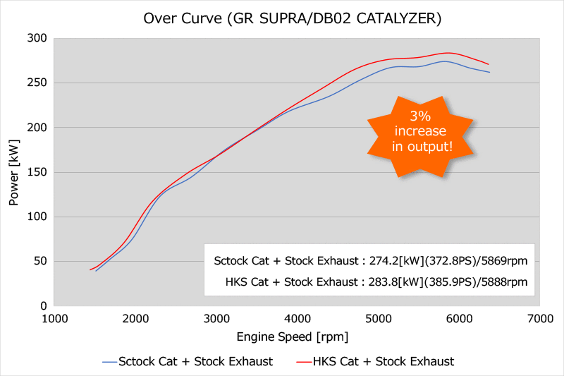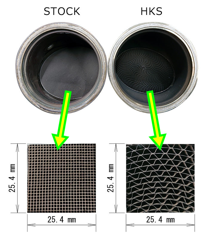 | Product Description | Combines superb efficiency and purification performance! ■FeaturesThe HKS catalyzer has 150 cells compared to the stock catalyzer‘s 600 cells, resulting in a 40% lower exhaust pressure.Gain an approx. 13PS advantage by just replacing catalyzer. (In-house test)The outlet is made by lost wax casting in order to produce ideal layout.The product satisfies the new emission regulations by selected a cell with an optimized ratio of catalytic precious metals.WLTC emission tests are thoroughly conducted in-house, and a third-party test certificate is obtained. |