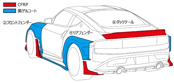 | Remarks | Kit Contents: 1. Front Spoiler, 2. Front Fender, 3. Rear Fender, 4. Side Skirt CARBON is used for the red parts in the image. The rest of the parts are FRP. |