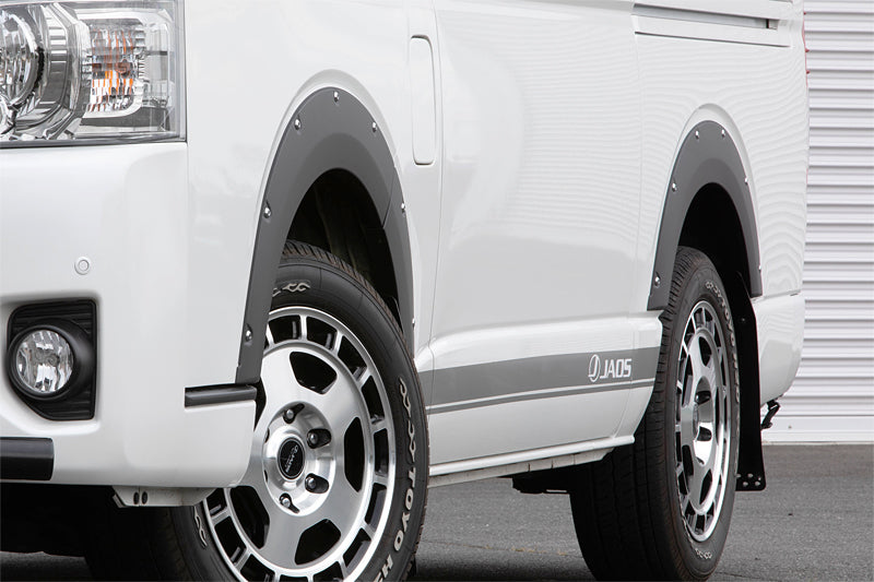 | Product Description | The "JAOS Fender Garnish type-X" for Hiace, which has been receiving more orders as the popularity of vehicles has increased, has changed from "FRP" to "FRP" in order to achieve stable productivity and quality while maintaining the popular design. Reborn as "made of ABS". The original dummy bolts that do not require processing of the fender surface and look like bolts and the precise design give a wild impression to the side view despite the compact design. Since it has been painted in the versatile original color "Matte Black (textured paint)", it can be installed smoothly without the trouble and time of painting. Product details: Fender garnish left and right set (6 pieces), dummy bolt (26 pieces) Specifications: Fender garnish: ABS (painted product: matte black_textured) Dummy bolt: ABS, chrome plating |