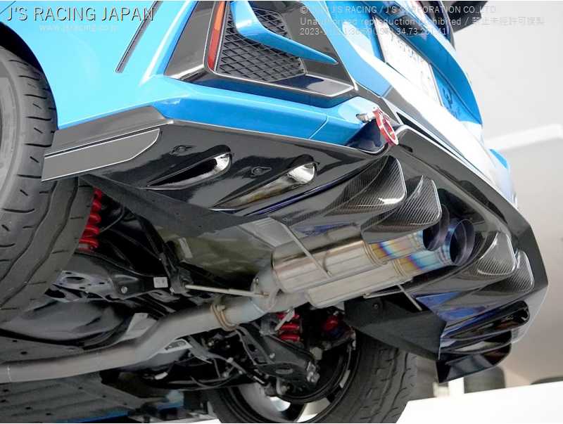 | Remarks | ・For FK8 TYPE-R only ・Since it is molded with a J'SRACING muffler, cutting may be required for vehicles that have an external muffler replacement. ・For mounting, drilling is required to fix bolts and nuts. ・This product is designed with priority given to the downforce effect. If you use the genuine jack-up point, please cut the marking part. ・Made of Carbon ・Be sure to perform fitting work and painting before installing this product. |