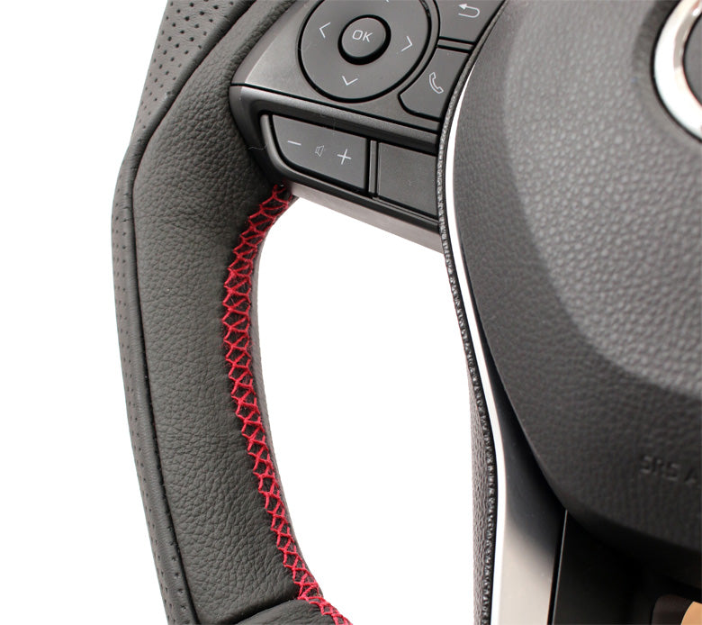 | Product Description | ・Sporty gun grip & D shape design ・Uses genuine New Zealand cowhide that feels good to the touch ・Inner half uses textured leather that matches the surface of the interior. ・Punching leather with excellent breathability is used for the gun grip. ・There are two types of stitches: TD01 red stitch and TD02 silver stitch. ・Original airbags, horn units, switches, etc. ・Steering wheel size is W380mm×H370mm ・In the load test and torque capacity test conducted by the inspection agency, the strength equivalent to the genuine product has been confirmed. |