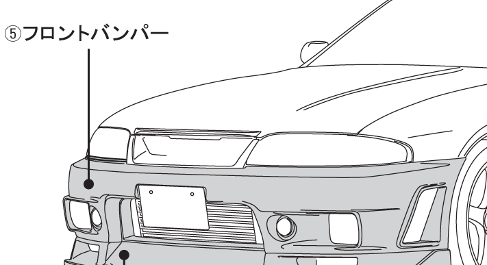 Front bumper (air intake specification for NISMO air-cooled oil cooler)] Air intake and air outlet are located on both sides of the bumper (net bonded). The engine oil cooler is mounted on the left side. Under spoiler can be installed either standard or NISMO. It is not possible to install the intercooler net (because it does not have a stay or claw for attachment like a standard bumper). If the thicker intercooler is installed than the standard product, processing may be necessary. |