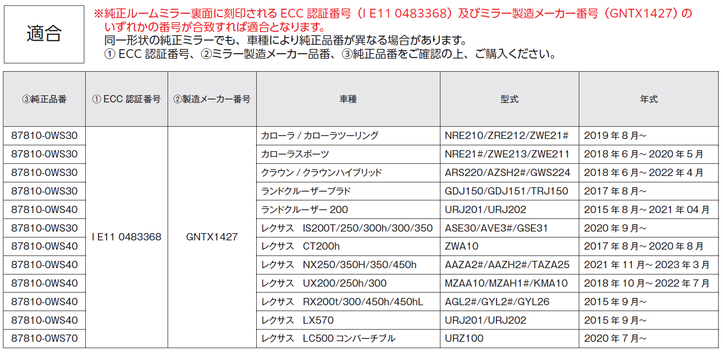 | Product Description | A frameless type mirror that can be easily attached to the genuine rearview mirror with one touch without tools. A blue coating is used to reduce the reflection of light on the surface mirror that ensures a clear view. The field of view area is up to about 1.4 times wider than mass production. The radius of curvature of the mirrors is 3000SR, which reduces parallax with the side mirrors and realizes a wide field of view and a natural sense of distance. TOM'S logo in the upper center. ■ Compatibility 3Genuine part number 1ECE certification number 2Manufacturer number Vehicle model Model year ~ 87810-0WS30 Corolla Sport NRE21#/ZWE213/ZWE211 June 2018 - May 2020 87810-0WS30 Crown/Crown Hybrid ARS220/AZSH2#/GWS224 June 2018 - April 2022 87810-0WS30 Land Cruiser Prado GDJ150/GDJ151/TRJ150 August 2017~ 87810-0WS40 Land Cruiser 200 URJ201/URJ202 August 2015~April 2021 87810-0WS30 Lexus IS200T/250/3 00h/ 300/350 ASE30/AVE3#/GSE31 September 2020~ 87810-0WS40 Lexus CT200h ZWA10 August 2017~August 2020 87810-0WS40 Lexus NX250/350H/350/450h AAZA2#/AAZH2 #/TAZA25 November 2021 - March 2023 87810-0WS40 Lexus UX200/250h/300 MZAA10/MZAH1#/KMA10 October 2018 - July 2022 87810-0WS40 Lexus RX200t/300/ 450h/450hL AGL2#/GYL2#/GYL26 From September 2015 87810-0WS40 Lexus LX570 URJ201/URJ202 From September 2015 87810-0WS70 Lexus LC500 Convertible URZ100 From July 2020 br> |